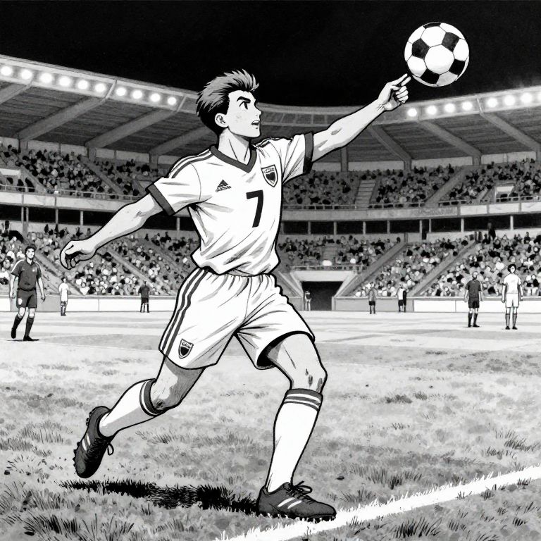 The Queen Of Hearts A football player on a pitch, at night, shooting for win the game, in a manga illustration::3 grayscale color::2.4,