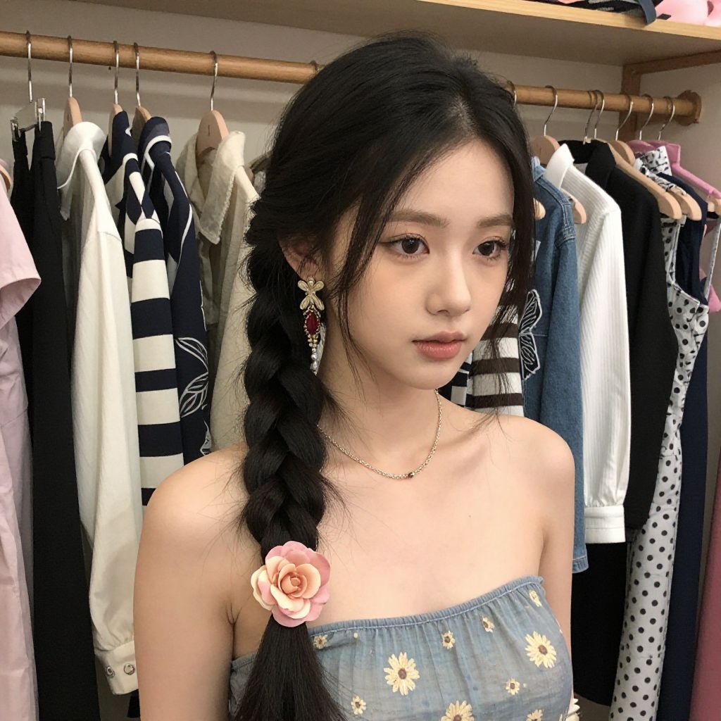 "gabby dollhouse clothes, 1girl, solo, jewelry, black hair, flower, hair ornament, braid, hair flower, looking at viewer, necklace, earrings, dress, long hair, realistic, hair over shoulder, long sleeves Realistic photo of casual sexy person with pretty face"