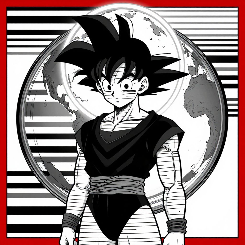 Vector Poster Art, Two Toned bleaked Red and black, Closeup Portrait, Monochrome, Closeup Portrait of a minimalism surreal black Silhouette Striped goku with an earth Like halo infront a Striped space universe embedded in a grignani inspired monochrome with greyscale lines, 1girl, panty, an Image completely made of bold thick lines, perfectly aligned, a 3d Illusion Made of line in the whole Art piece Like its one in black and white deep lined and striped space