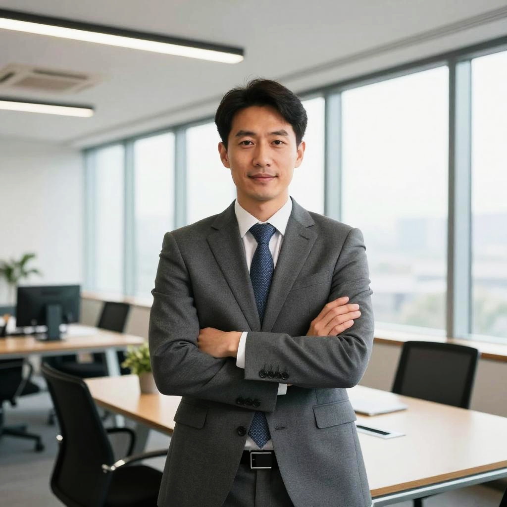 Photograph of an Asian man with short black hair, wearing a dark gray suit, white shirt, and navy blue tie, standing with arms crossed in a modern office. He has a fair complexion and a slight smile. The office features large windows allowing natural light, wooden desks with black office chairs, and a potted plant in the background. Fluorescent lights are visible on the ceiling. The overall setting is professional and bright, with a clean, minimalist design.