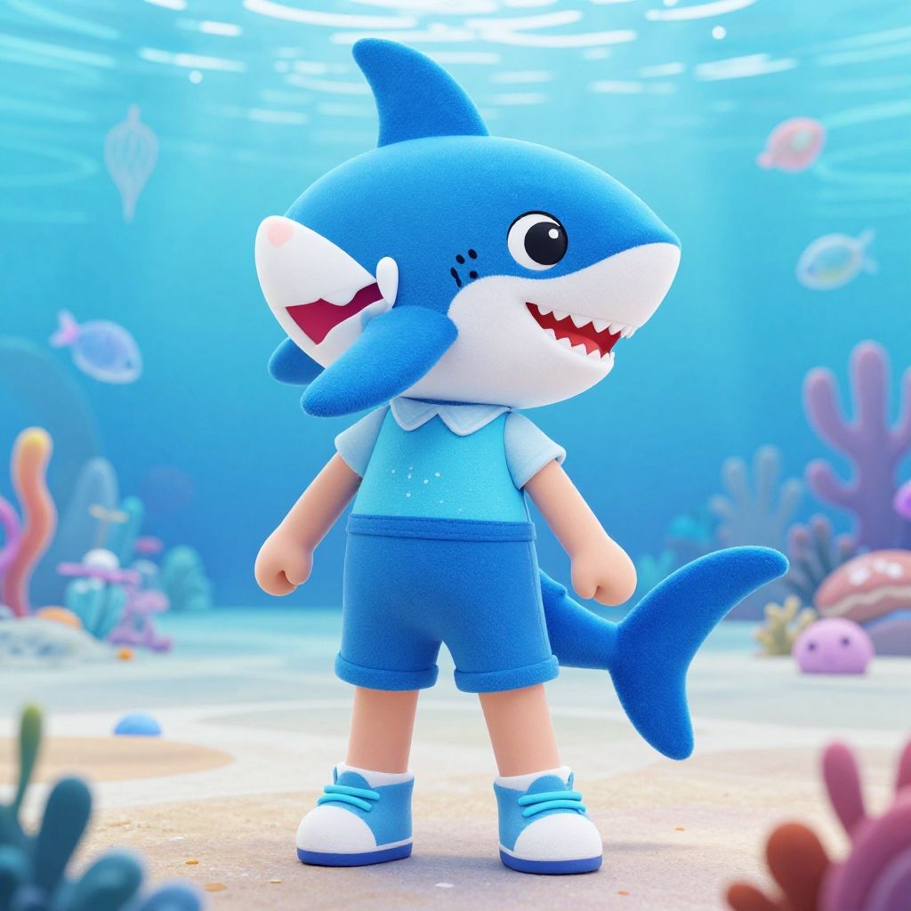 A digital CGI image of a cartoon shark child standing underwater. The shark character has a blue and white head with a smiling mouth, black eyes, and a fin. It wears a light blue shirt, matching blue shorts, and blue-and-white sneakers. The background features a vibrant underwater scene with colorful coral, fish, and bubbles, in shades of blue and purple. The light from above creates a bright, clear effect. The shark's pose is upright, with arms slightly forward and a tail visible. The overall style is cute and playful.