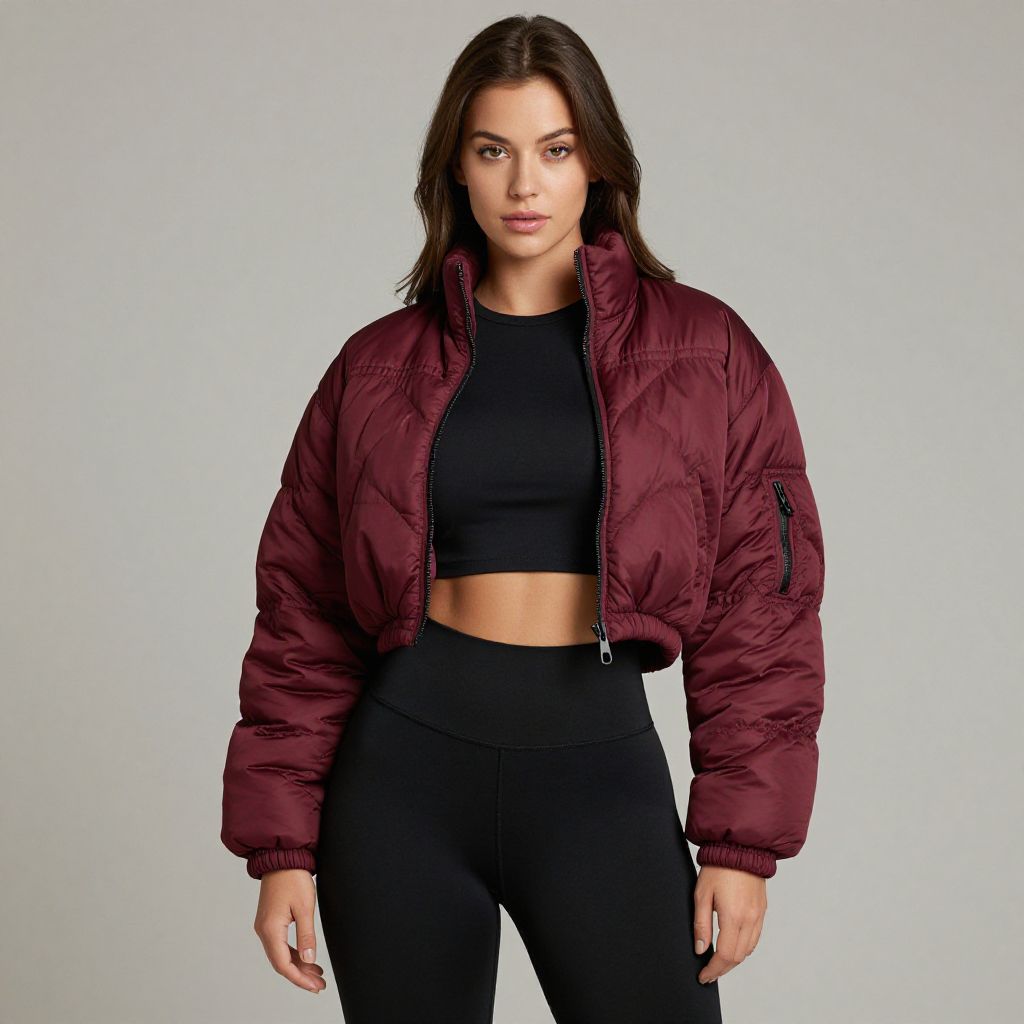 "Woman, streetwear, burgundy quilted crop bomber jacket, high neck, black zipper, drawstring hem, black fitted crop top, high-waisted black leggings, simple studio background. Sexy. Pretty face and beаutiful eyes. Big breasts."