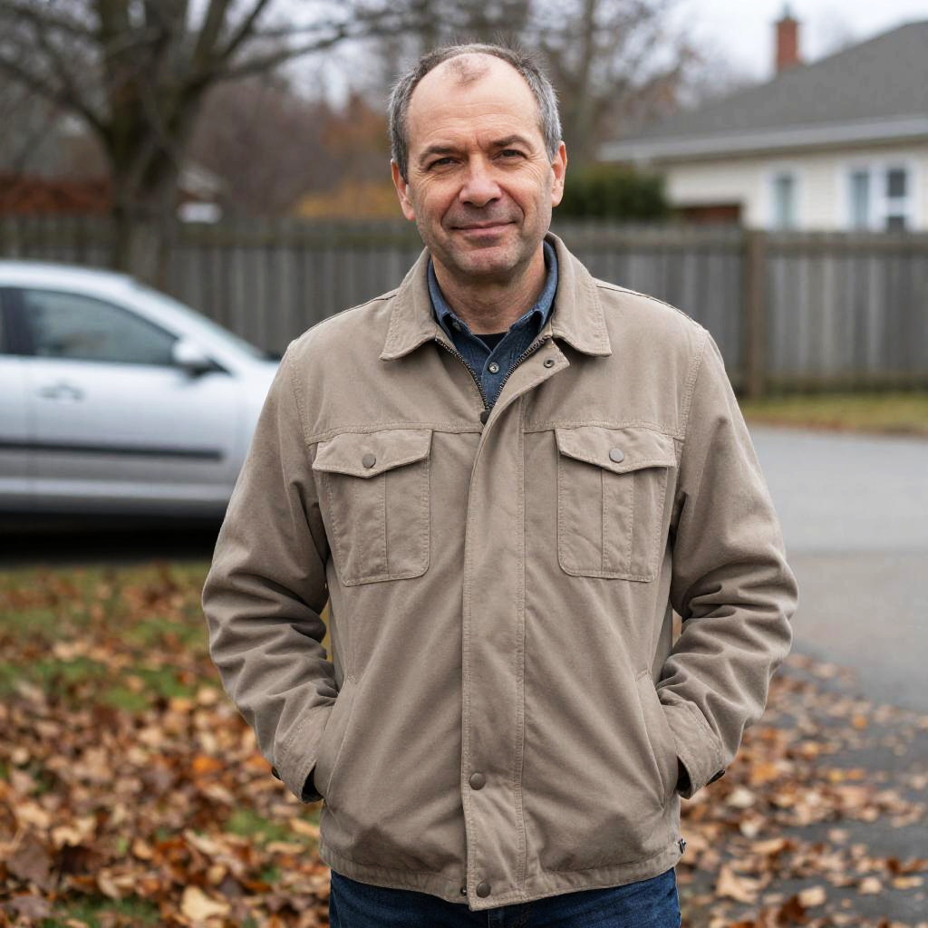 Photograph of a smiling, middle-aged man with a gray beard and mustache, wearing a flat cap and black-and-white checkered shirt. He stands in front of a chain-link fence with a blurred, outdoor background. The man's relaxed, friendly expression contrasts with the industrial setting.