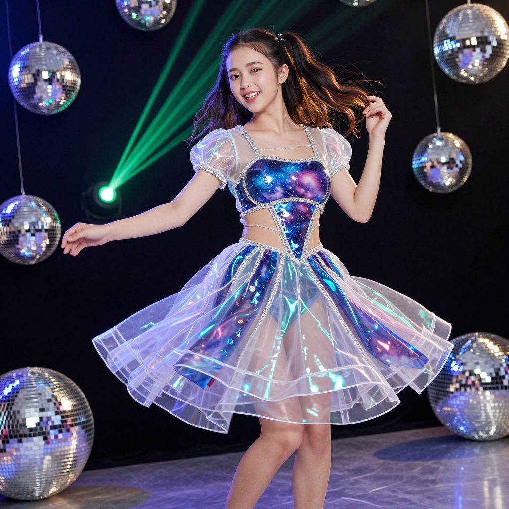 Photograph of a young Asian woman with long brown hair, smiling, dancing on stage. She wears a short, sparkling, holographic dress with puffed sleeves and a sheer, layered skirt. The dress features a blue and purple star-patterned bodice. The background is dark with green and white stage lights and several hanging silver disco balls reflecting light. The stage floor is shiny, and her pose is lively, with arms slightly raised and one hand touching her hair. The overall scene is vibrant and energetic.