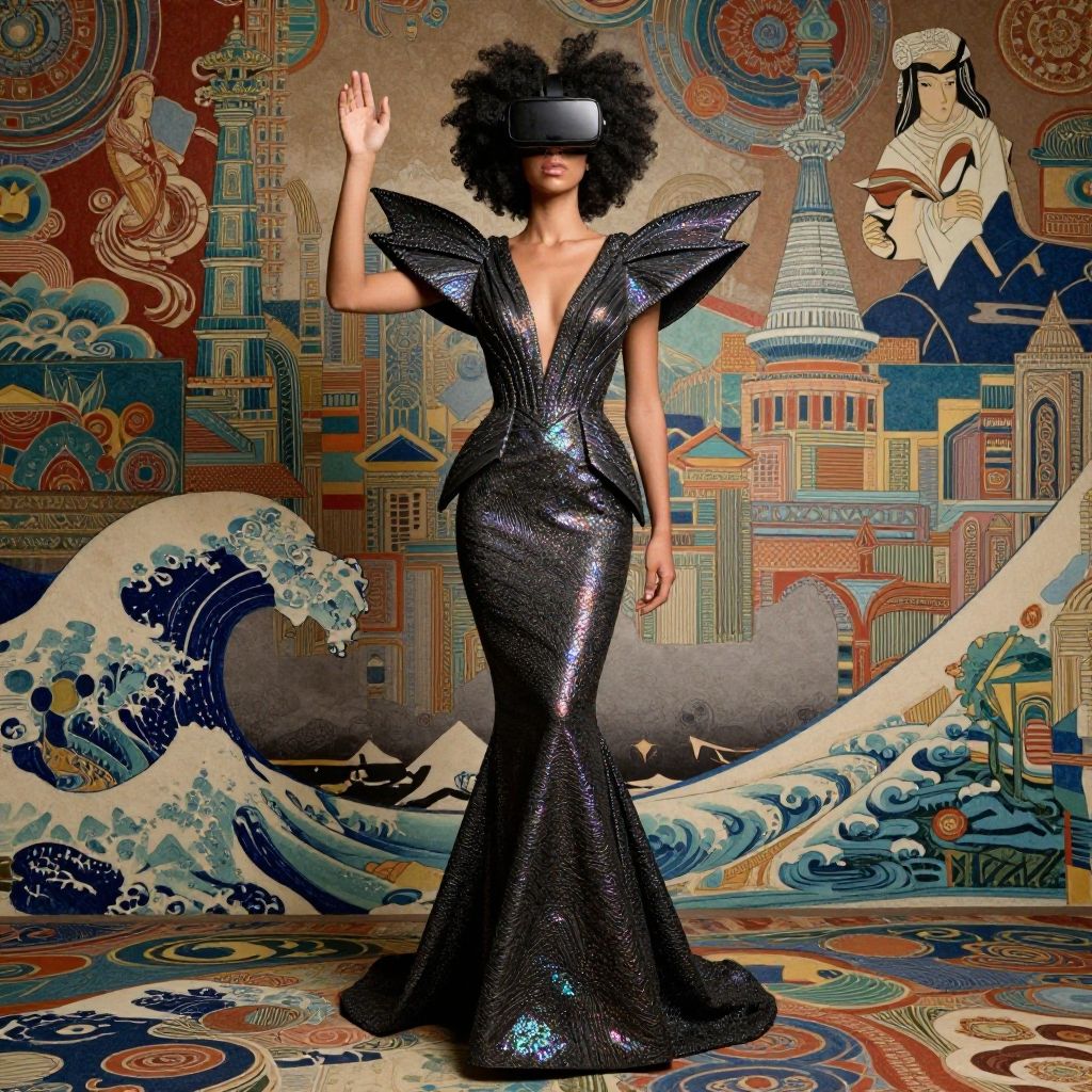 Professional fashion portrait, realistic, best quality, high quality, masterpiece, intricately detailed, Random blend of art-styles and fashion styles and ancient civilizations, Conceptual Art, breakA super model, well-favored, parted lips, dynamic pose, breakfull body clothing, v-neck, holographic thread, virtual reality tools, Batwing Sleeves, __styles/clothing/dress-Length__, High Waist, mermaid skirt, Side Seam Slits, by Katsushika Hokusai and Katsushika Hokusai and by yun216 and Karl Lagerfeld, afrofuturism, Futuristic fashion, [(details:1.2): [ (many small details:1.3) : [ (many ultrasmall details: 1.2):(very detailed ultrasmall edges and microrelief:1.5):0.7 ]: 0.4 ] :0.2], breakIntricately detailed background, random composition, diverse textures and patterns, mix of architectural styles, natural and urban elements, vibrant colors, varying lighting conditions, richly decorated, unexpected details, high resolution, visually complex, immersive environment, this image combines historical elegance with science fiction, creating a visually stunning and imaginative artwork, breakadvanced lighting techniques, high dynamic range, vivid and accurate colors, harmonious color scheme, meticulously detailed, visually stunning, emotionally engaging, sharp contrast, digital painting quality, cinematic quality, subtle shadows, Complex Shading, Immersive Depth, Advanced Rendering, Depth of Field, sharp focus, Depth and Perspective, bokeh, vintage, faded film, film grain