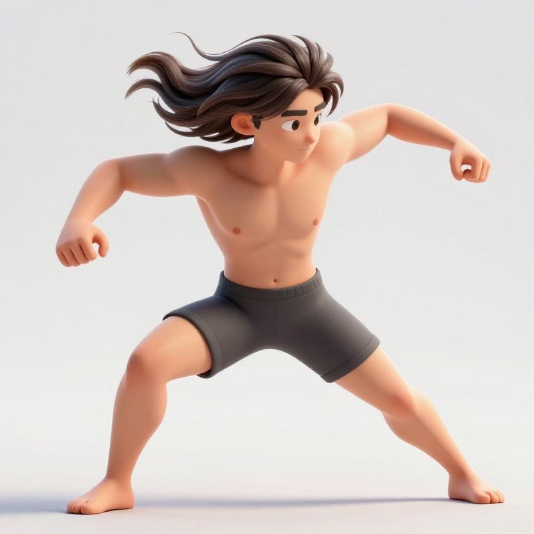 This is a digital 3D cartoon-style image of a muscular, young man with light skin and long, flowing black hair. He is shirtless, showcasing a defined chest and abs, and wears black boxer shorts. The man is in a dynamic fighting stance, with his right arm bent and fist clenched, and his left arm extended forward. His facial expression is intense, with furrowed brows and focused eyes. The background is completely white, emphasizing the character. The image has a smooth, polished texture with vibrant colors and clean lines, characteristic of modern digital animation.