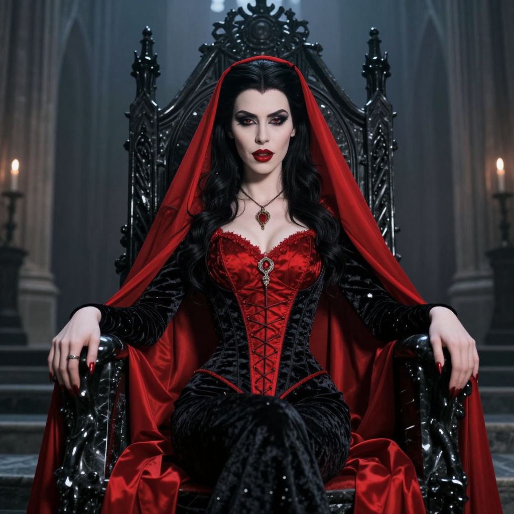 Photograph-style digital artwork: Gothic queen with pale skin, dark hair, red lipstick, red corset, black fur, throne, red veil,