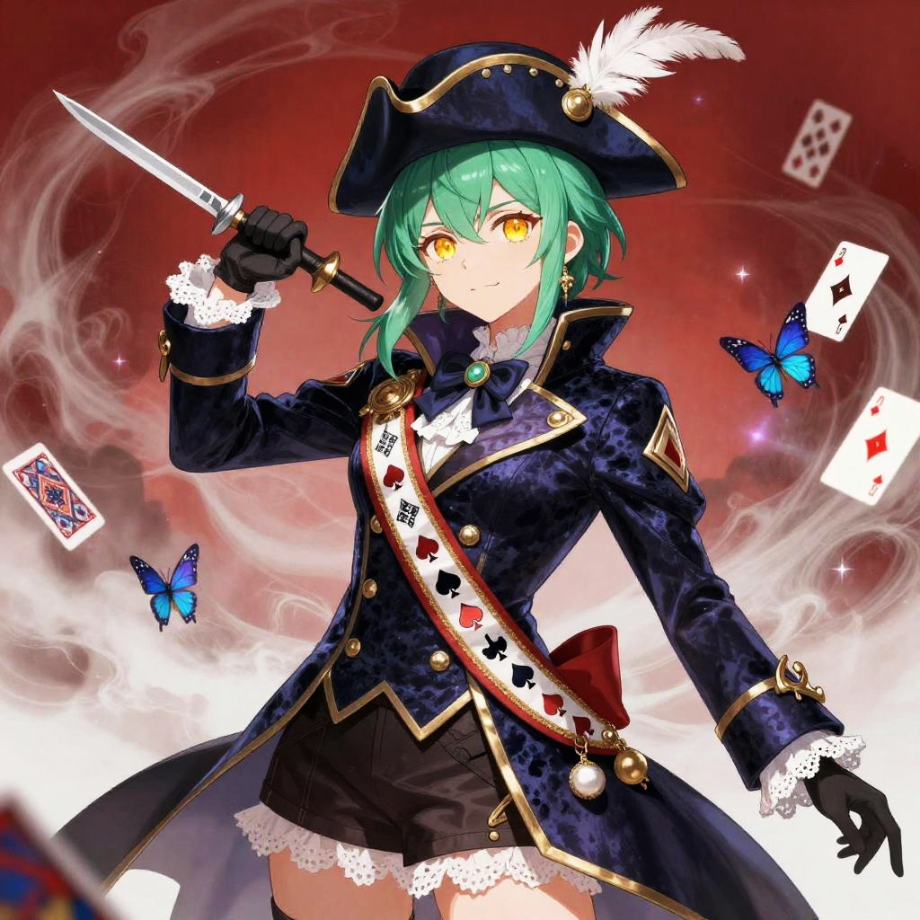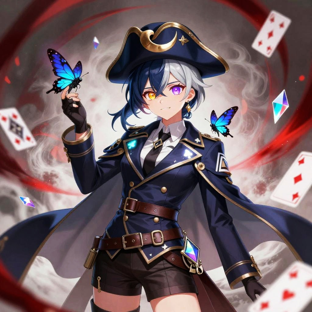 Anime style female character with midnight-blue to silver ombre hair and heterochromatic amber (left) and violet (right) eyes, wearing a corsair-inspired naval blazer with luminescent card-suit embroidery, asymmetrical cape, layered leather belts, and a crescent-trimmed tricorn hat, holding bioluminescent moths and reflective prism shards, surrounded by floating playing cards. The scene features a dynamic swirling smoky background with bright red and white highlights, intricate costume details, sharp expressive eyes, and an energetic and magical atmosphere. Rendered in high contrast and vibrant colors as detailed digital art.
