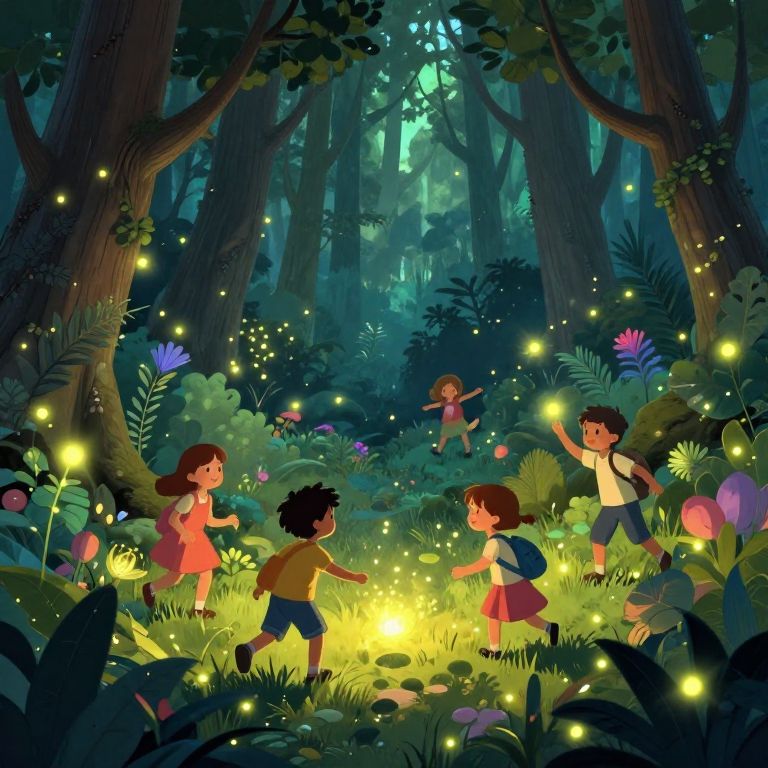 Youthness visualized as a magical forest glade with youthful figures playing and exploring, surrounded by luminescent plants and fireflies, embodying innocence, curiosity, and the vibrant pulse of life in nature.