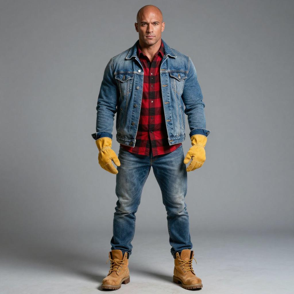 Photograph of a bald, muscular man standing confidently against a gray background. He's wearing a blue denim jacket over a red and black plaid shirt, blue jeans, and tan work boots. Bright yellow work gloves add a pop of color. His serious expression and strong stance suggest he's ready for manual work. The lighting is even, highlighting his outfit and physique.