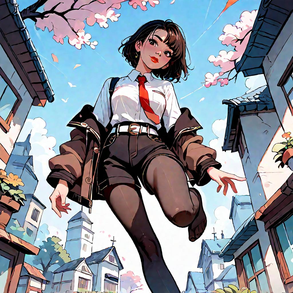 Score_9, score_8_up, score_7_up, source_anime, 1girl, feet, from below, pov, standing on one leg, toes, brown jacket, off shoulder, white shirt, red necktie, black shorts, pantyhose, legwear under shorts, white belt