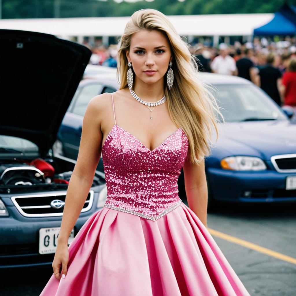 Concert wear woman costume,1girl, dress, blonde hair, car, realistic, earrings, blurry background, jewelry, blurry, solo, long hair, pink dress, skirt hold, motor vehicle
