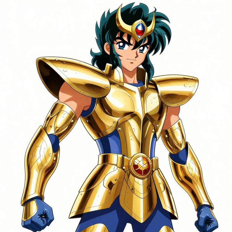 This digital anime-style drawing features a young man with spiky black hair wearing a golden, shoulder-plate armor set with a red gem on a crown-like headpiece. His armor includes a chest plate, arm guards, and a belt with a matching red gem. He has blue eyes, a determined expression, and wears blue gloves and pants. The background is plain white, emphasizing his vibrant, shiny armor and the contrasting colors of his clothing and accessories. The art style is bold and colorful, with strong outlines and a slightly exaggerated, heroic appearance.