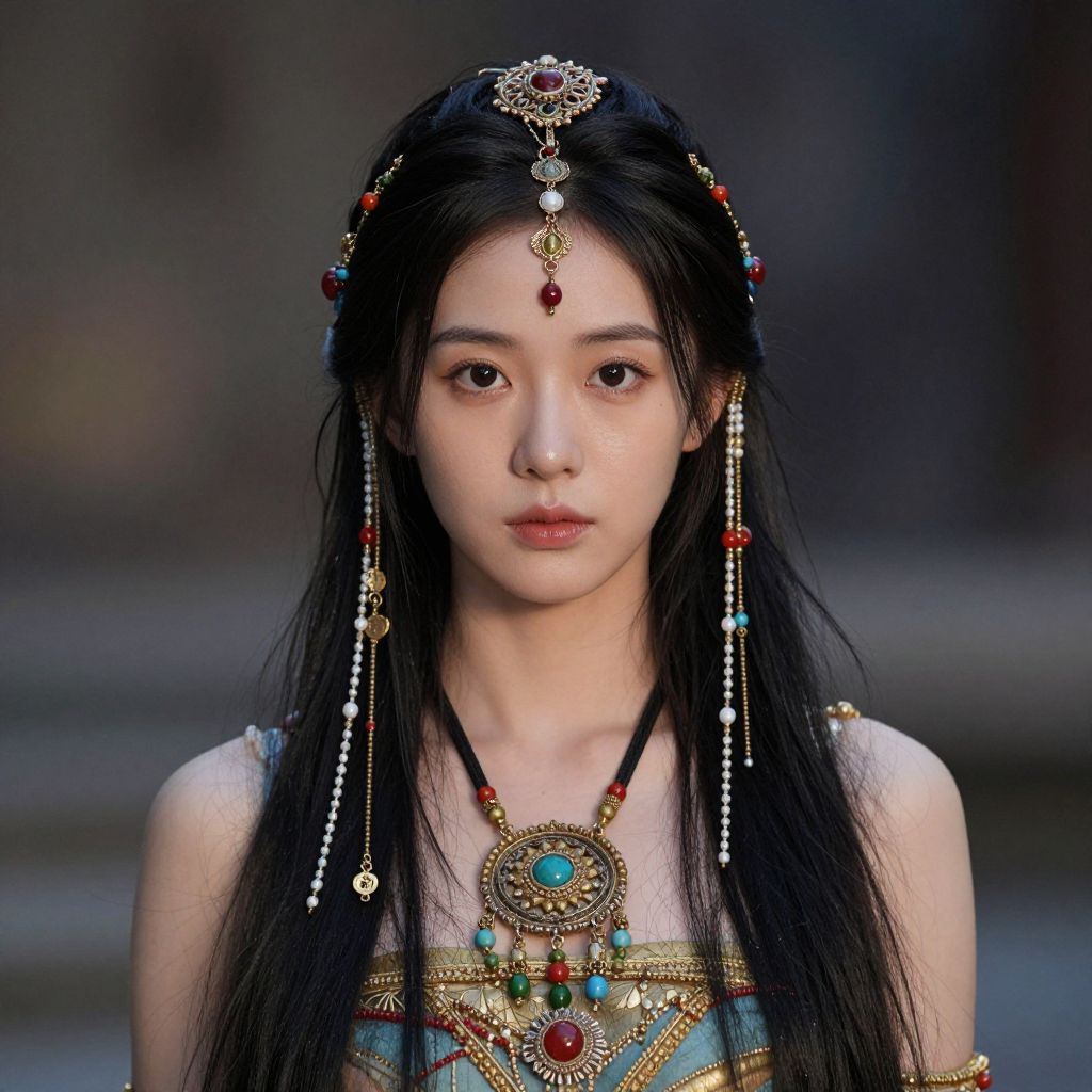 Photograph of an East Asian woman with long, straight black hair adorned with a jeweled headpiece and red, gold, and turquoise earrings. She wears a detailed, ornate necklace with a large, central turquoise stone and intricate gold patterns. Her facial expression is neutral, with soft features and fair skin. The background is blurred, featuring dark, earthy tones. She is dressed in a sleeveless, blue and gold traditional garment. The image has a realistic, high-definition style, focusing on her upper body and face.