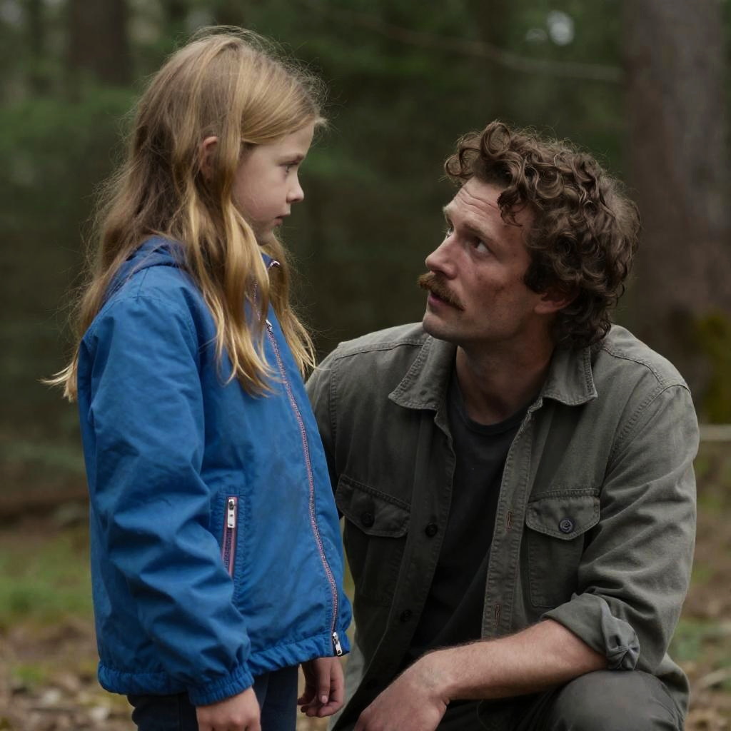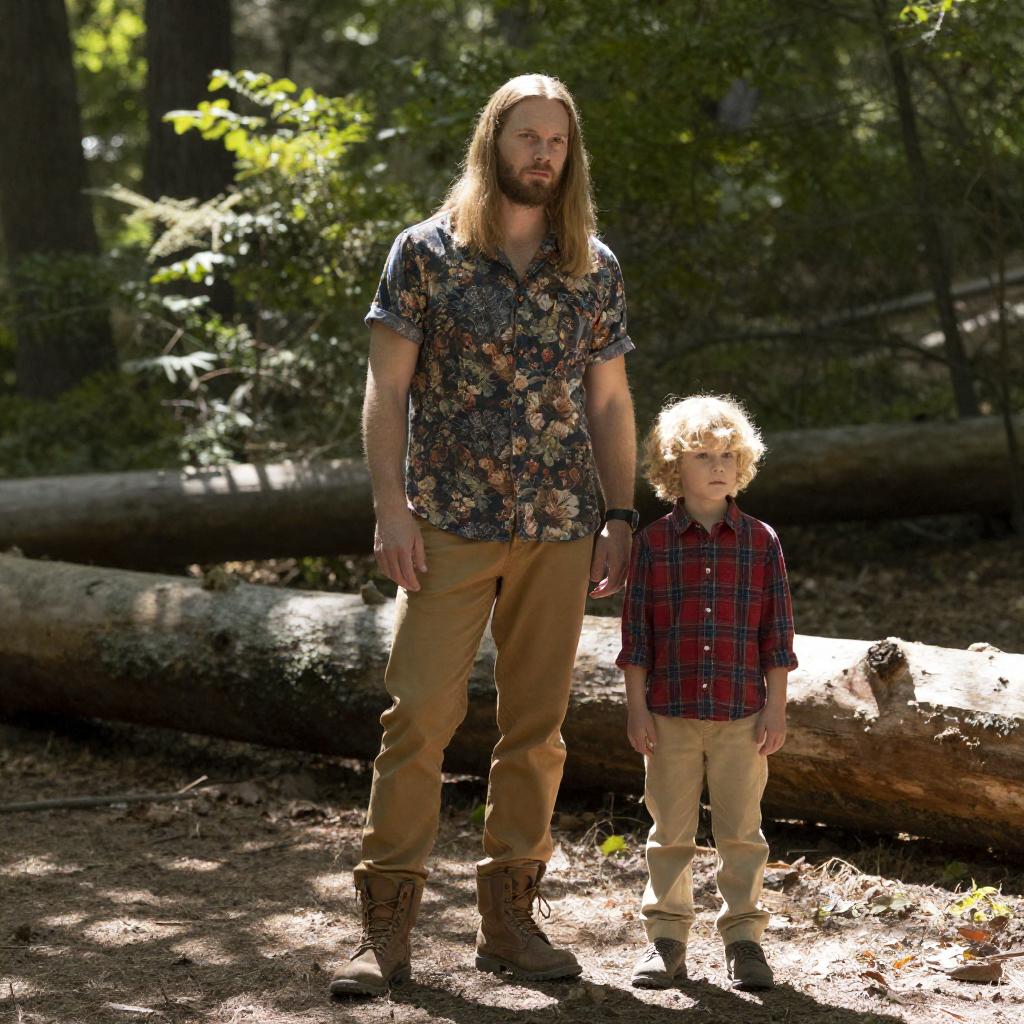 Photograph of a man and boy walking through a misty forest. The man, with a beard and plaid shirt, looks serious. The boy, with curly hair and beige shirt, looks curious. Tall trees in the background. Both in front view.