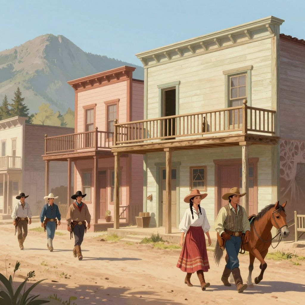 Digital illustration of a ghost town street in the Old West, featuring pastel-colored two-story buildings with wooden balconies. The scene is set in morning light with mountains visible in the background. Several cowboys and cowgirls, depicted with Mexican and Italian cultural influences, dressed in period clothing including wide-brimmed hats and dresses, walk along the dusty street.