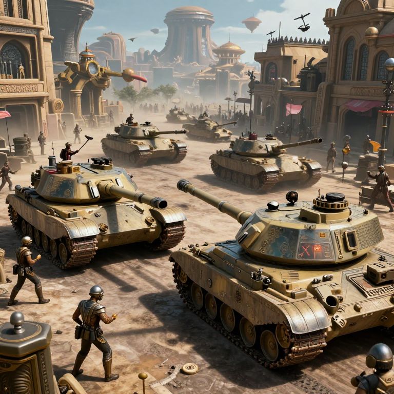 Advanced soldiers and tanks of the Intergalactic Empire of Wakanda engage in a fierce battle on the streets of an alien world, with intricate details and a photo-realistic 8k resolution.
