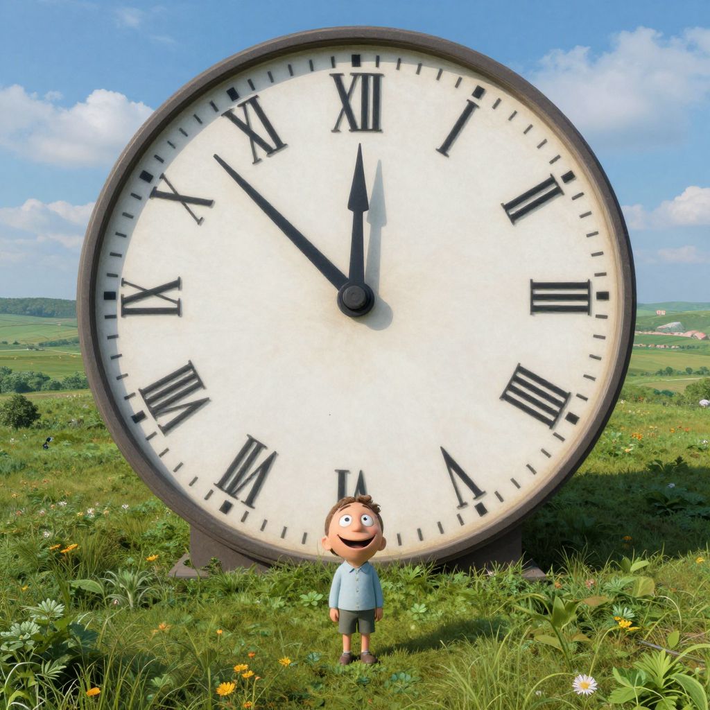 A digital illustration depicts a giant, black-rimmed, white-faced clock with Roman numerals, standing in a lush, green meadow with yellow flowers. In the foreground, a cartoon-style boy with light skin, brown hair, and a blue shirt stands smiling. The clock's hands show the time as approximately 10:10. The sky above is bright blue with fluffy white clouds. The clock's massive size contrasts with the boy's small stature, emphasizing its enormous scale. The overall scene is cheerful and whimsical.
