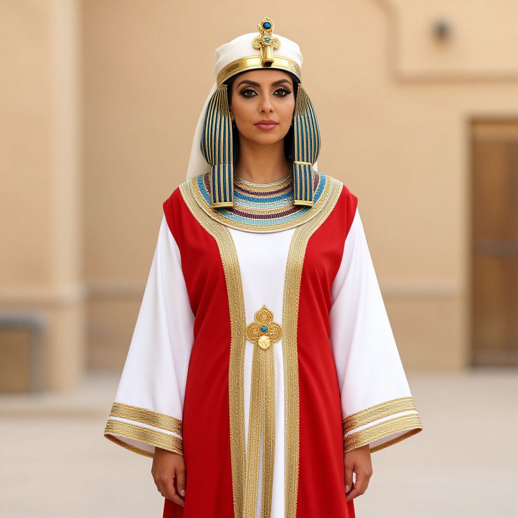 Photorealistic CGI of a young woman in ancient Egyptian attire, wearing a white and red robe with gold trim, striped wig, and ornate head