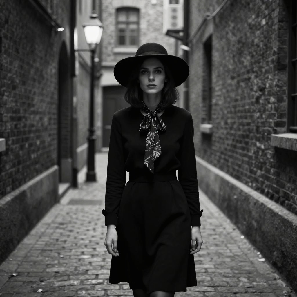 Black-and-white photograph of a young woman with curly hair, wearing a white shirt and dark dress, riding a bicycle down a cobblestone alleyway