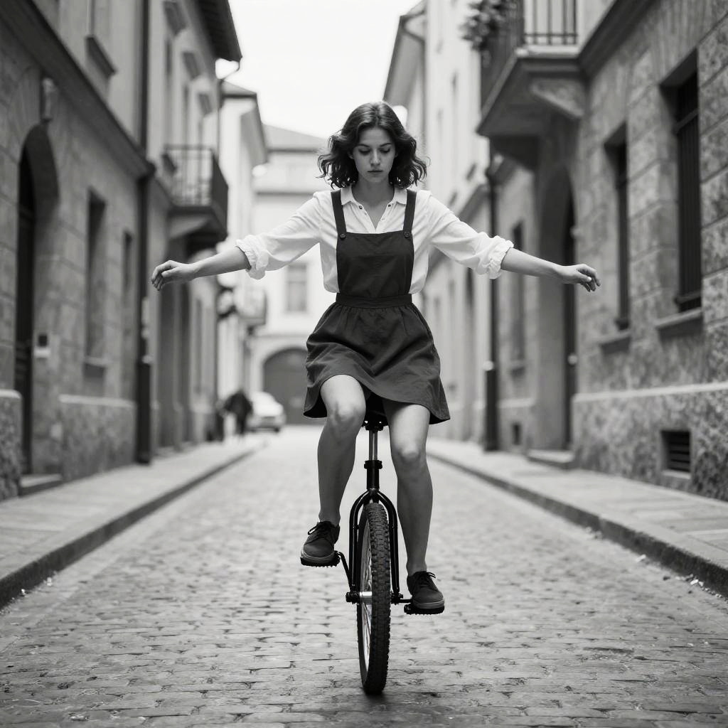 A black-and-white photo of a young woman balancing on a unicycle in a narrow, cobblestone street between old stone buildings. She has dark, wavy hair and is wearing a white blouse with long sleeves under a dark pinafore dress. Her arms are outstretched for balance, and she has a focused expression. The street is empty, with tall buildings on either side, creating a dramatic, narrow perspective.