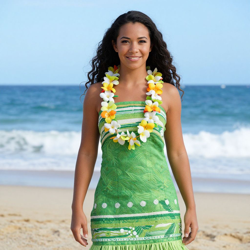 Pua Moana Costume, woman in a green dress and a flower lei lei