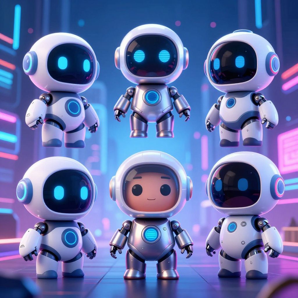 Photorealistic CGI of six cute, chibi-style, white robotic dolls with glowing blue eyes and accents, standing in a neon-lit futuristic background