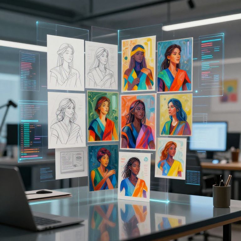 Digital art studio scene: color and black-and-white sketches of diverse women in vibrant outfits, floating on a modern desk with glowing code and monitors in the