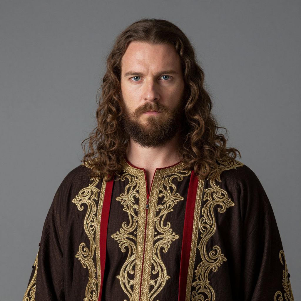 A photograph of a serious-looking man with long, wavy brown hair and a full beard, wearing a dark brown robe with intricate gold embroidery and red trim. His eyes are blue, and he gazes directly at the camera against a plain gray background. The robe's design suggests a historical or regal style.