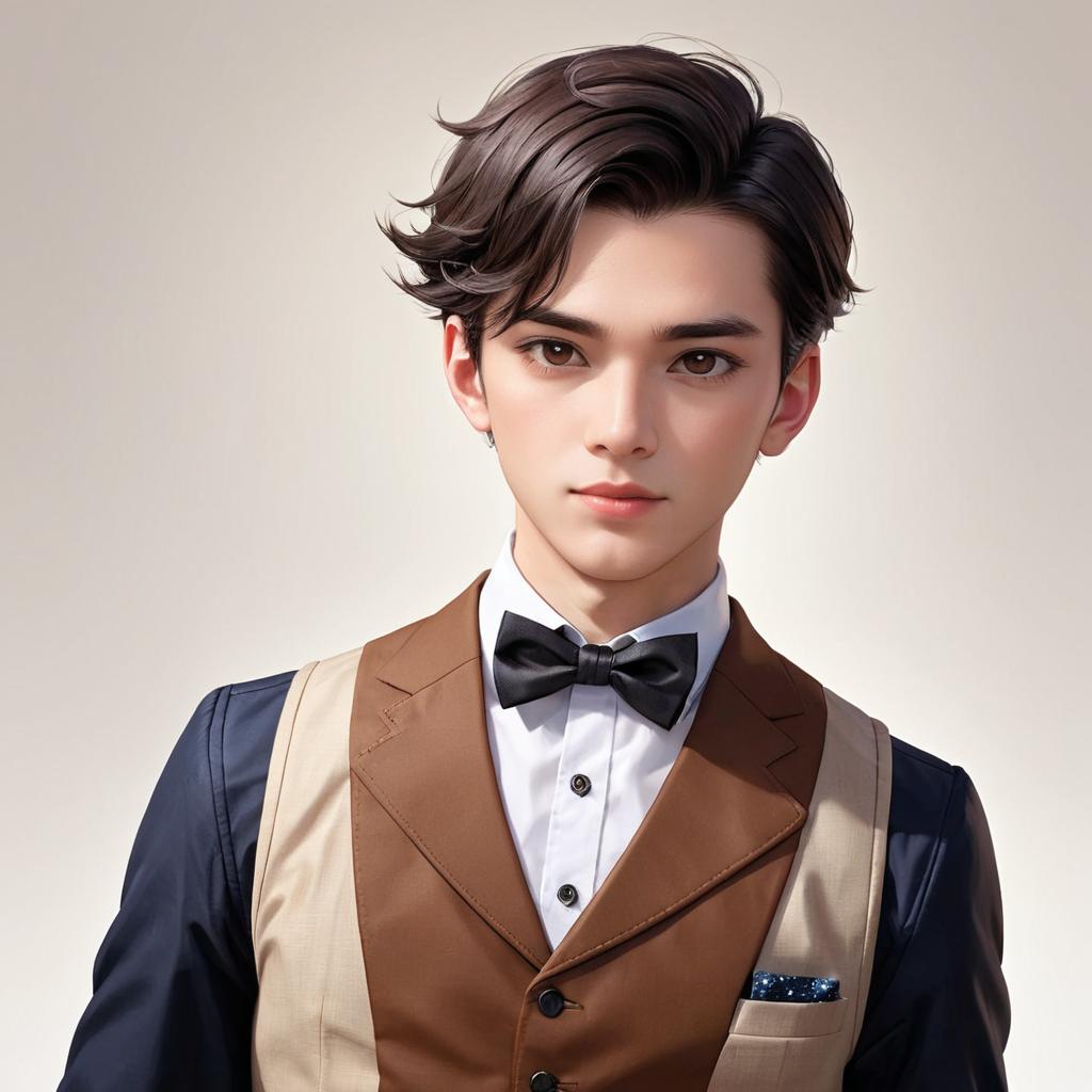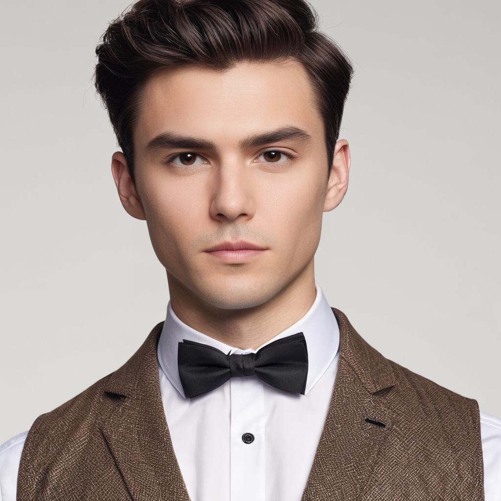 Portrait of a young man wearing a brown suit jacket, white dress shirt, black bow tie, and black vest. The man has dark brown hair styled neatly and light skin tone, standing against a plain grey background.