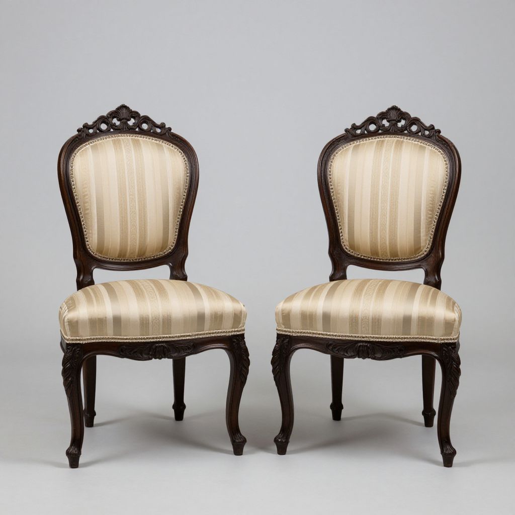 Pair of intricately carved Victorian dining chairs with striped upholstery showcased against a neutral background, highlighting their elegant craftsmanship and classic design.