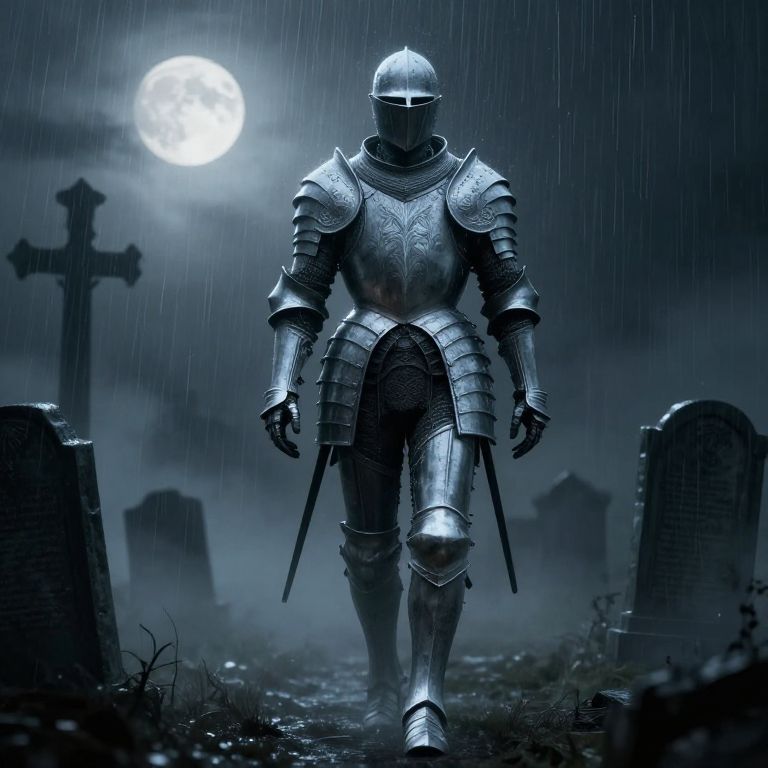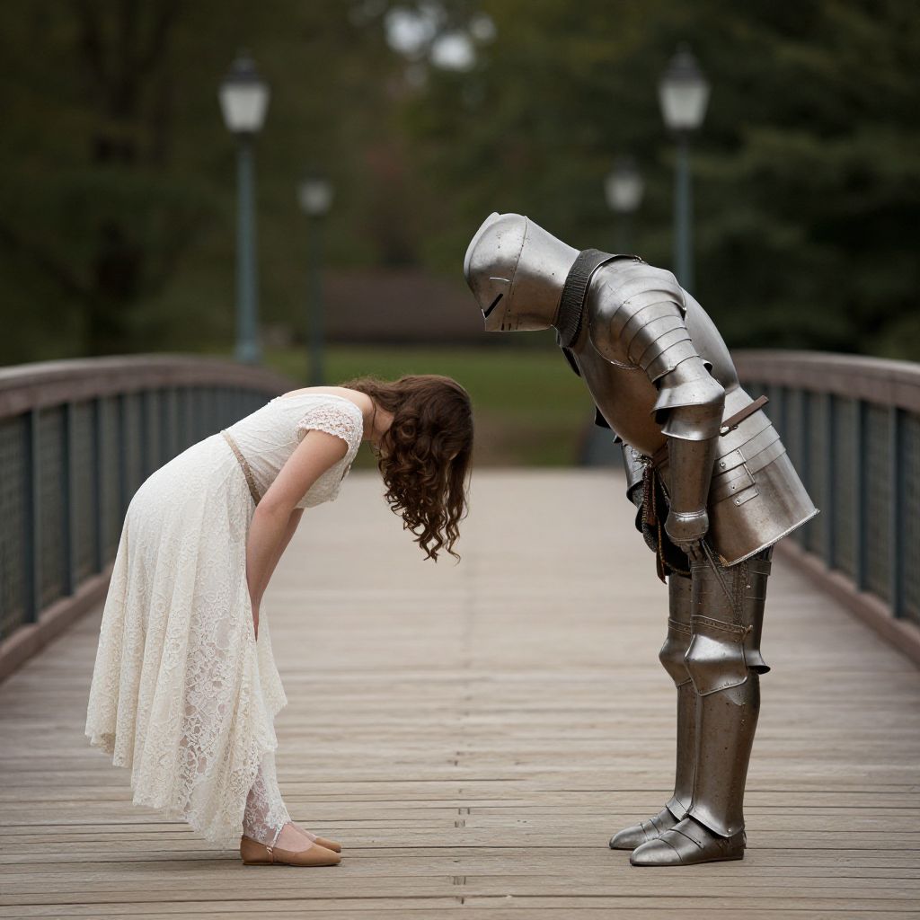 Photograph of a woman in a white lace dress and brown sandals, bending forward with her head down, facing a silver, full-body knight armor with a helmet, also bending forward. They stand on a wooden bridge with metal railings, blurred green trees and lamp posts in the background. The woman's long, curly brown hair cascades down, contrasting with the metallic sheen of the knight's armor. The scene evokes a sense of solemnity and contrast between human softness and armor's rigidity. The lighting is natural, highlighting the textures of the lace dress and armor.