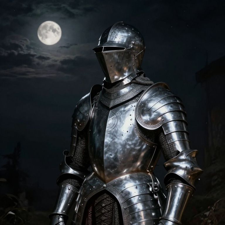 Photograph of a woman in a white lace dress and a silver knight statue bending towards each other on a wooden bridge.