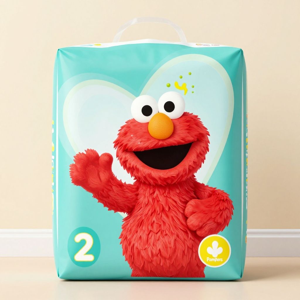 Pampers Elmo-themed nursery scene, baby playing with Elmo plush toy, diapers with Elmo print, colorful toys,, cozy lighting, warm and inviting atmosphere