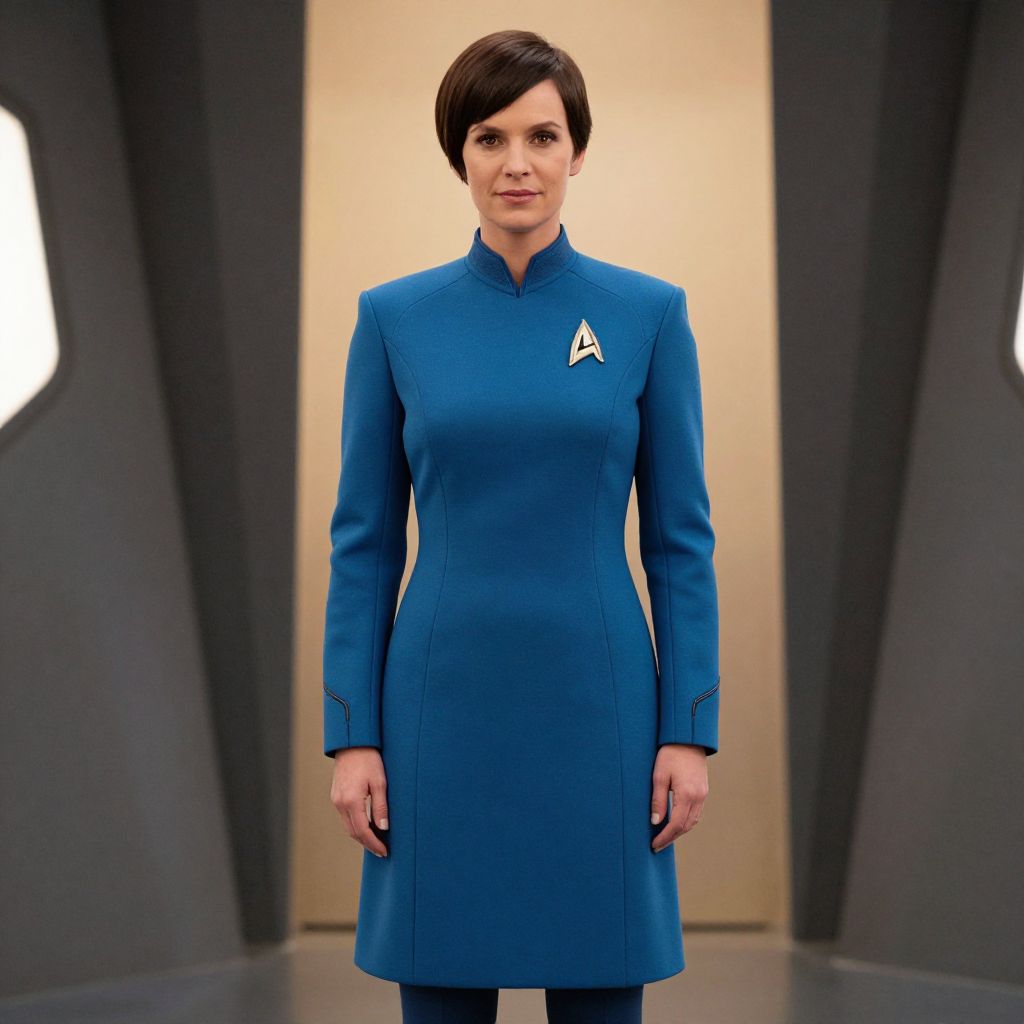 Photograph of a short-haired woman in a blue, long-sleeved Starfleet uniform with an insignia, standing in a futuristic, dimly