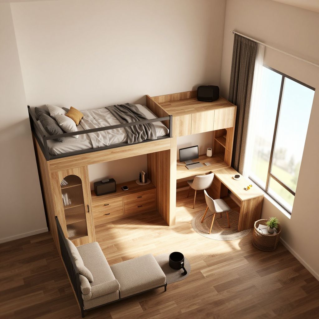 Floor plan studio apartment, artistic rendering showcasing a cozy modern space with open-concept layout, integrated storage solutions, loft bed, small workspace, large windows allowing sunlight, warm tones, stylish and efficient interior design.