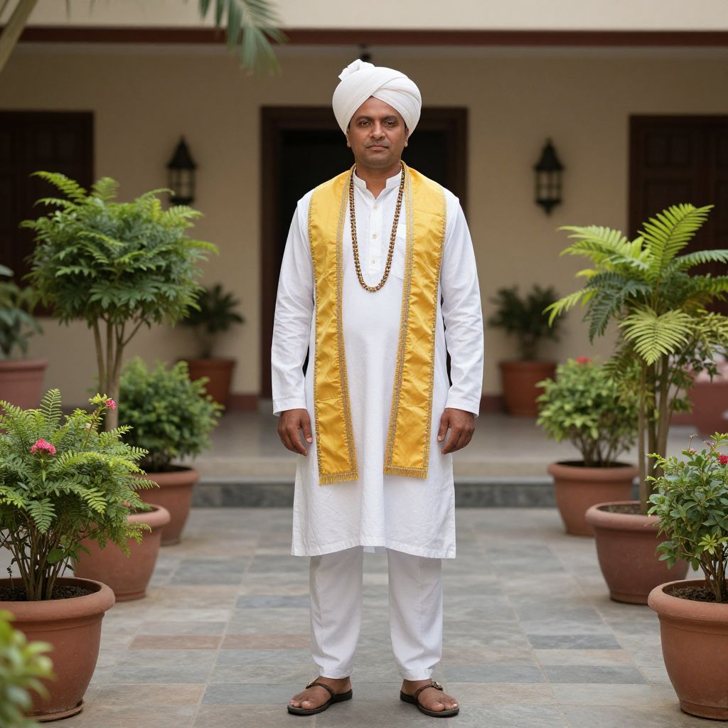 Photograph of a South Asian man standing in a courtyard. He has a medium brown skin tone, short black hair covered by a white turban, and wears a white kurta with loose-fitting white pants. Draped over his chest is a yellow floral garland, and he has a black beaded necklace. He wears brown leather sandals. The background features a beige building with dark wooden doors and windows, flanked by potted green plants. The courtyard floor is made of stone tiles, and the lighting is natural, suggesting an outdoor setting. The man stands centered, looking directly at the camera with a neutral expression.