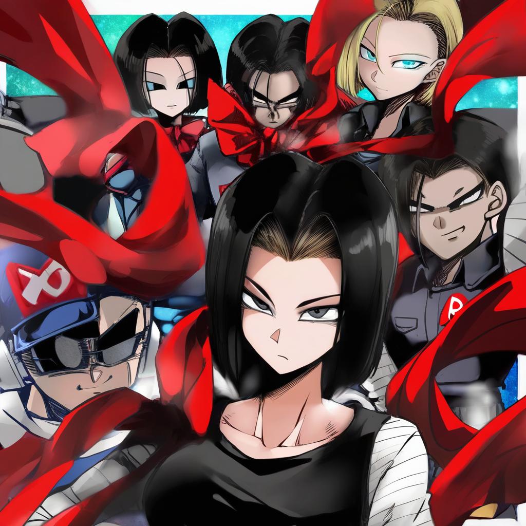 Digital anime-style illustration featuring Android 17 and his team members from the Dragon Ball series. The characters are depicted with sharp black hair, blue and black eyes, wearing dark clothing and red ribbons symbolizing the Red Ribbon Army. The style reflects modern digital anime art.