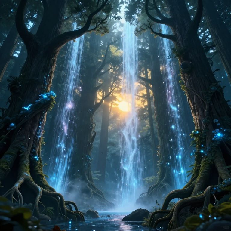 Digital fantasy artwork depicting a mystical forest with towering trees framing a central waterfall. Bright blue, glowing water cascades from the trees, illuminated by a warm, yellow sunbeam breaking through the foliage. The forest floor is dark with exposed roots, and luminous blue fireflies dot the scene. The background showcases a dense, enchanting forest with a foggy atmosphere. The image combines vibrant colors and glowing elements, creating a magical, ethereal setting.