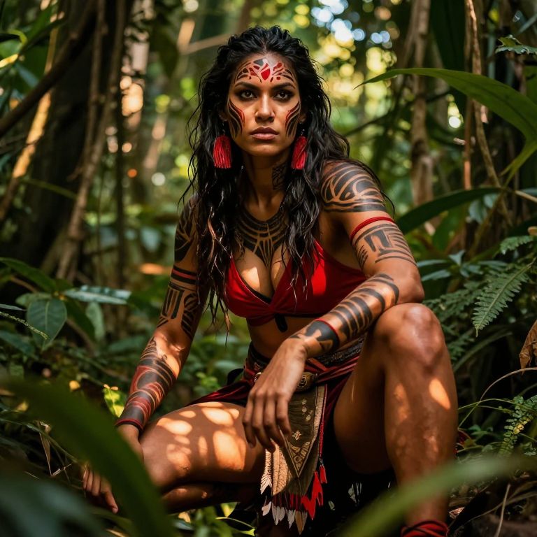 A powerful portrait in a dynamic, expressive style, featuring a formidable female warrior with intricate tribal markings covering her arms and face. The scene is captured from a low-angle viewpoint, highlighting the subject's unwavering strength as she sits amid an overgrown jungle setting. Warm, golden light filters through the dense foliage, casting dappled shadows across her muscular physique and illuminating her resolute gaze. The color palette of rich earth tones, vivid greens, and bold red accents mirrors the intensity of her stare, while the overall mood conveys a sense of primal grace and unshakable determination.