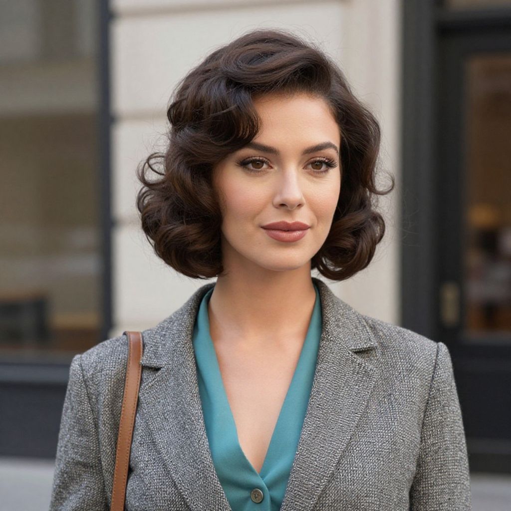 Stylish woman with a modern Carol Brady haircut in a trendy urban setting, sharp feathered edges and soft curls blended seamlessly, wearing chic retro-inspired clothing, the image capturing both vintage nostalgia and modern fashion sensibilities.