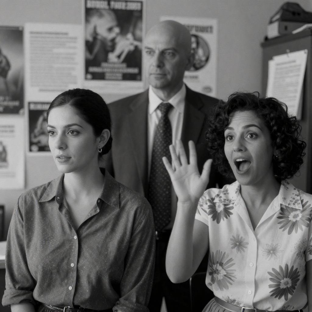Black-and-white photograph of three people in a cluttered room. A man with a bald head and dark suit stands behind a woman with dark hair and a patterned shirt, who looks to the left. A woman with short, curly hair and a floral shirt waves her hand excitedly. The background is filled with posters and papers.