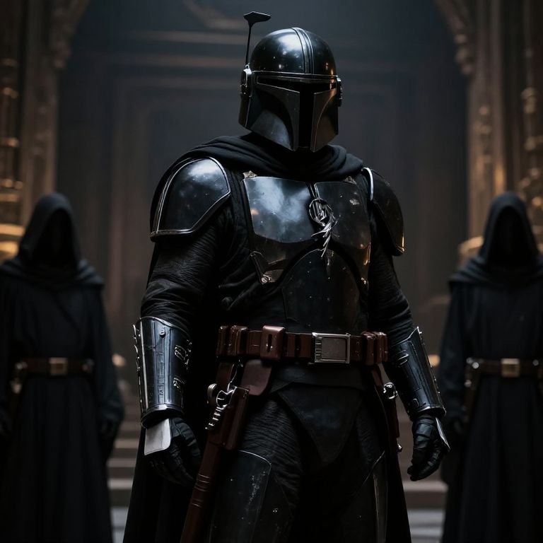 Black Mandalorian armor art, imposing warrior in heavy black armor, surrounded by cloaked figures in a dimly lit ancient temple, intricate armor detailing with metallic sheen, epic fantasy sci-fi crossover, high resolution digital artwork