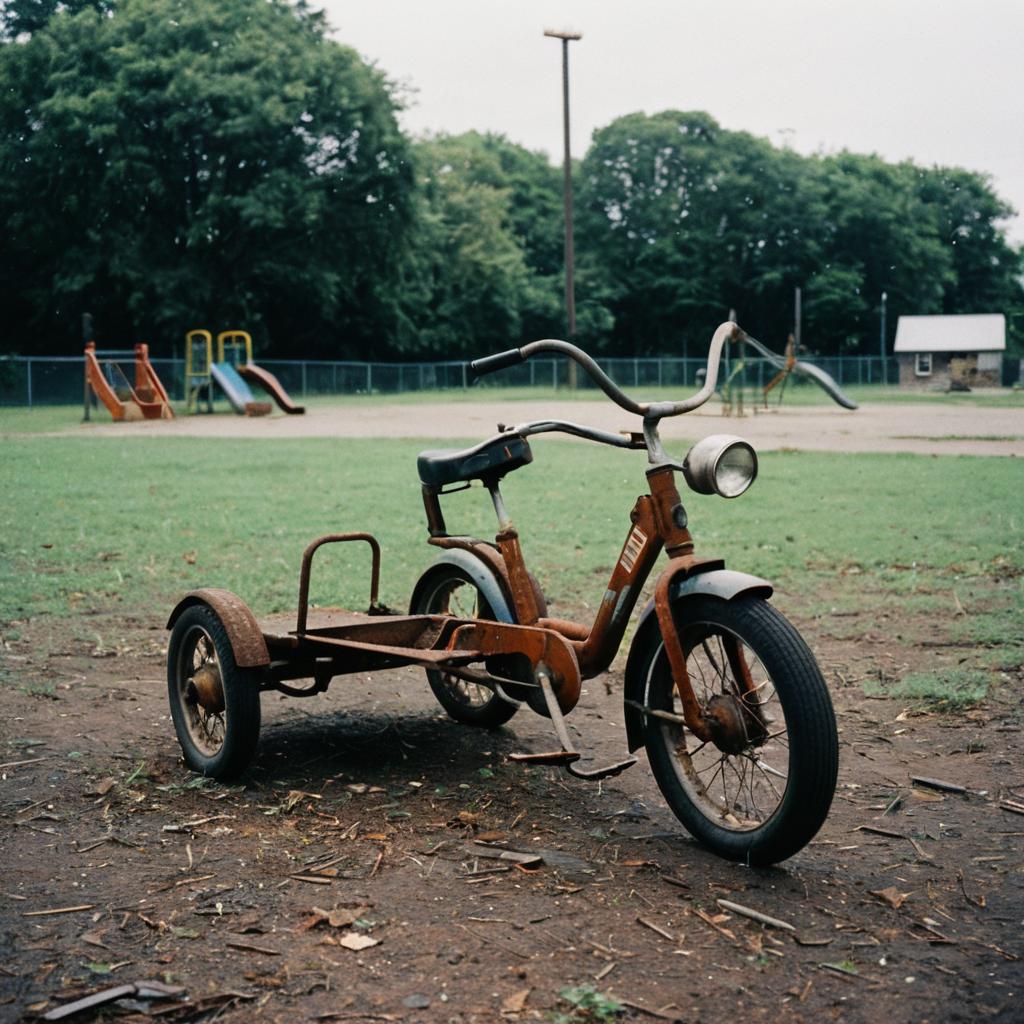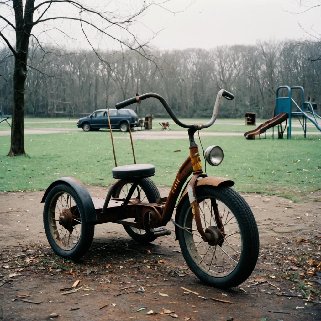 Fujifilm Pro 400H cinematic film still of rusted tricycle parked in forgotten playground during overcast noon.
