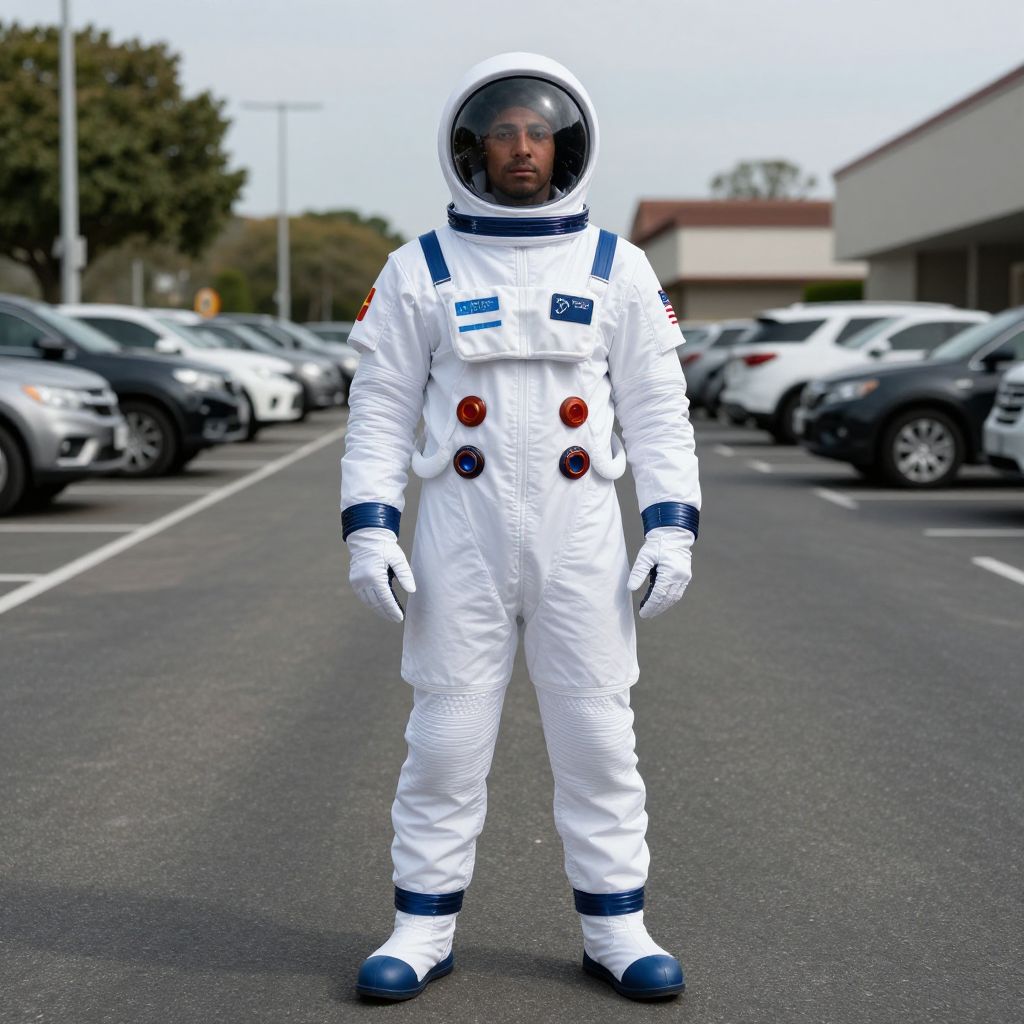 Spaceman Fancy Dress Costume, man in a space suit standing in a parking lot