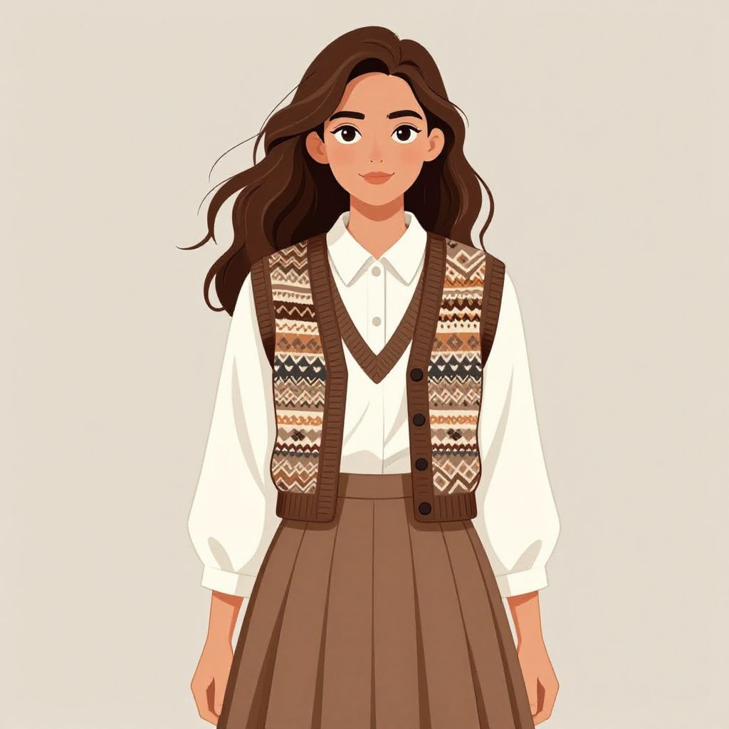 This is a digital illustration of a young woman with long, wavy brown hair and fair skin. She has large, expressive brown eyes and a slight smile. She wears a white long-sleeved shirt with a brown, patterned, V-neck vest that has geometric designs in beige, brown, and black. Her brown pleated skirt reaches to her knees. The background is plain white, emphasizing her outfit and appearance. The style is clean and modern, with bold lines and flat colors, resembling contemporary vector art.