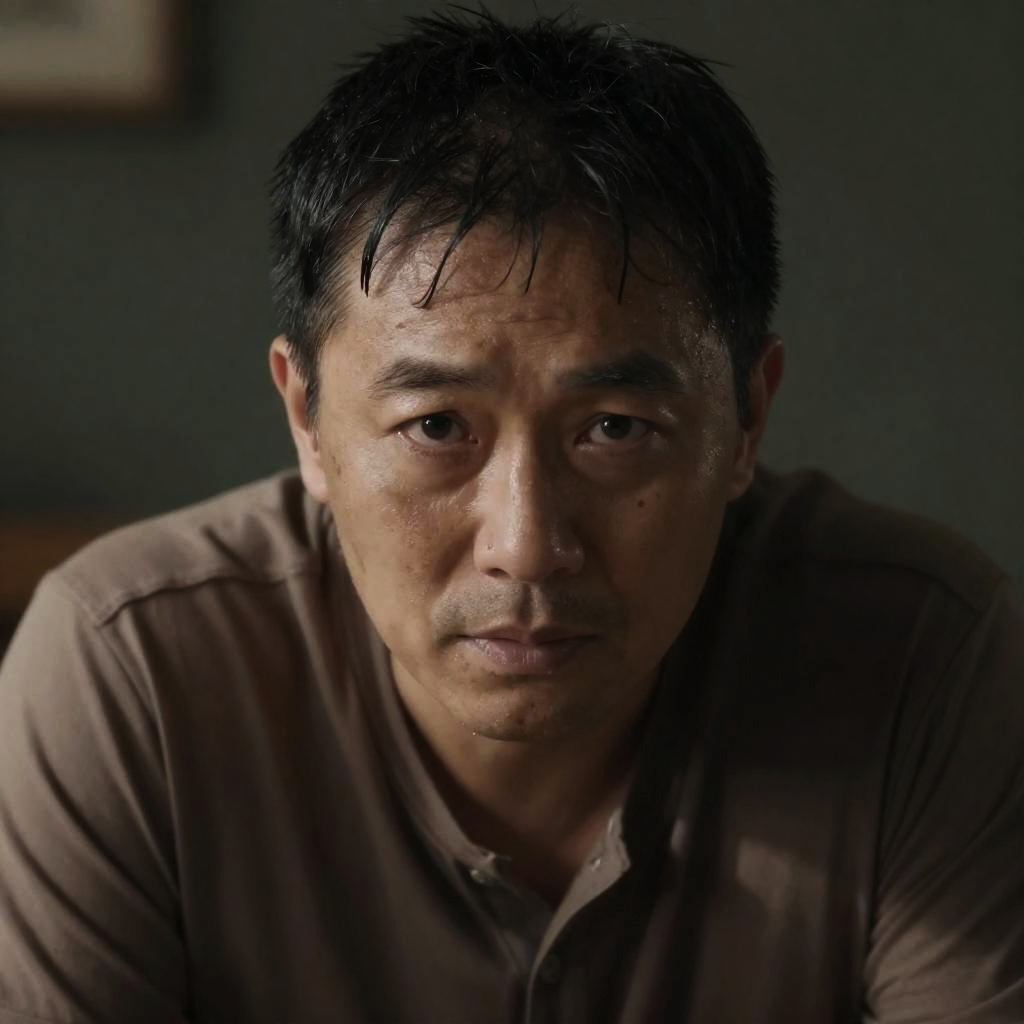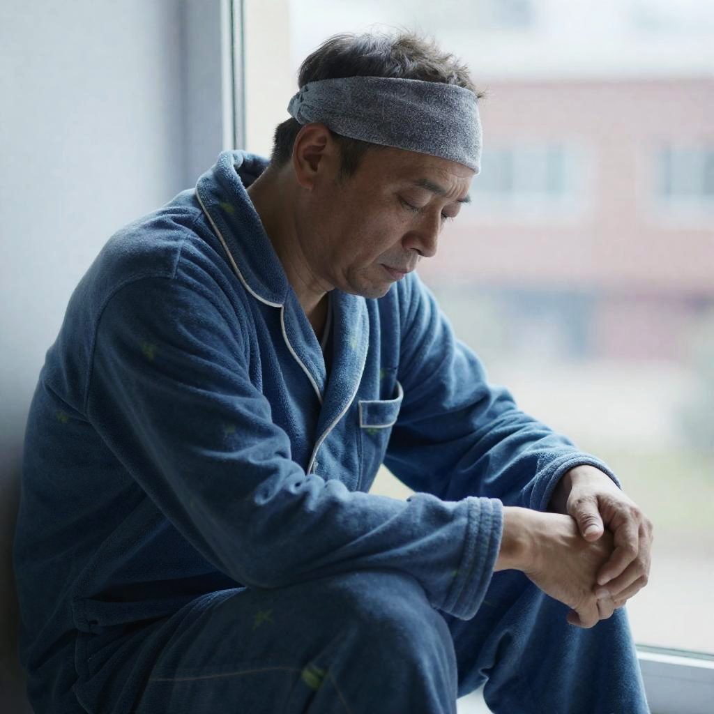 Photograph of a middle-aged man with a headband, wearing a blue pajama-style robe with green patterns, sitting hunched against a window. He has a tired expression, with pale skin and short hair. His hands are clasped together, and the background is blurred, showing an outdoor scene with indistinct structures.