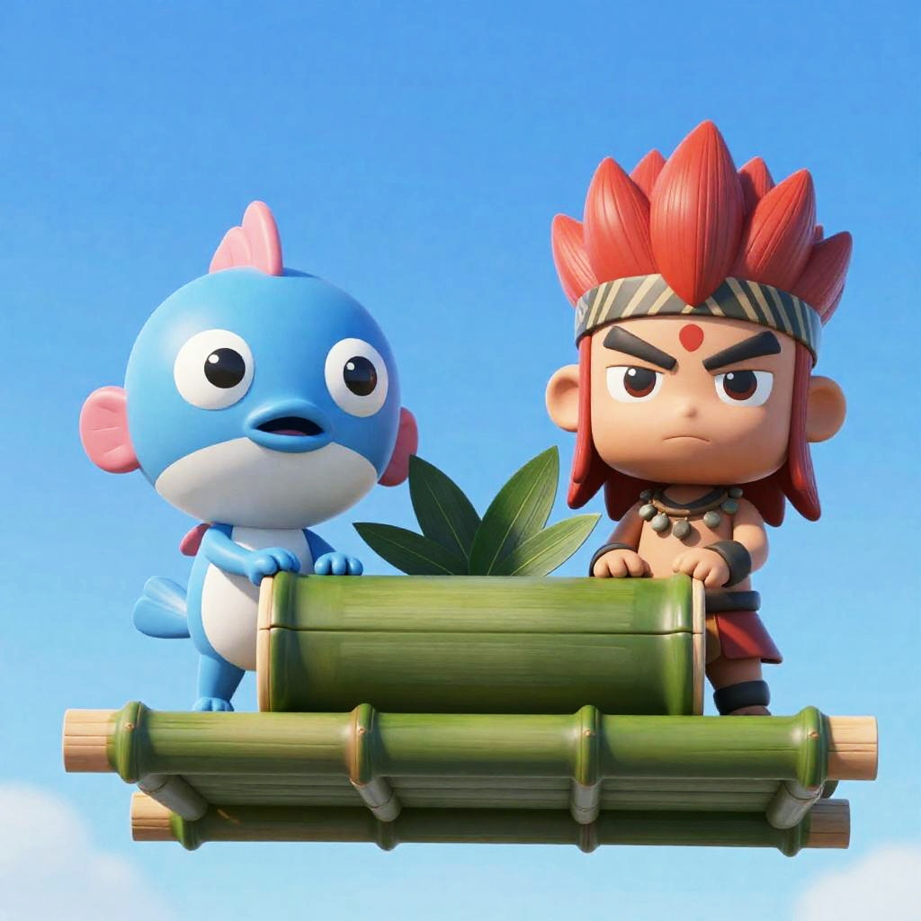 Photograph of two cartoonish, anthropomorphic characters hiding in a dense, sunlit forest. The character on the left has black, shaggy hair, large eyes, and a wide smile, while the character on the right has brown fur, large tusks, and a similar wide-eyed expression. Tall grass and green foliage surround them, creating a natural, secretive setting.