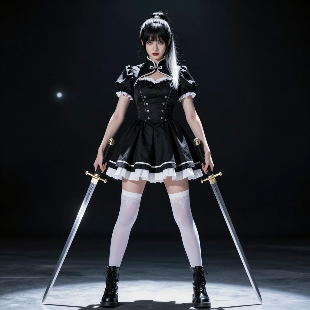 Woman in black gothic Lolita dress with long sleeves and layered skirt, black leather belt with buckles, holding katana. Wears black cap with silver emblem. Long black hair, pale skin, red lipstick. Standing in doorway, arms slightly outstretched. Dark green door frame in background. Edgy, intense facial expression. Photographic image.