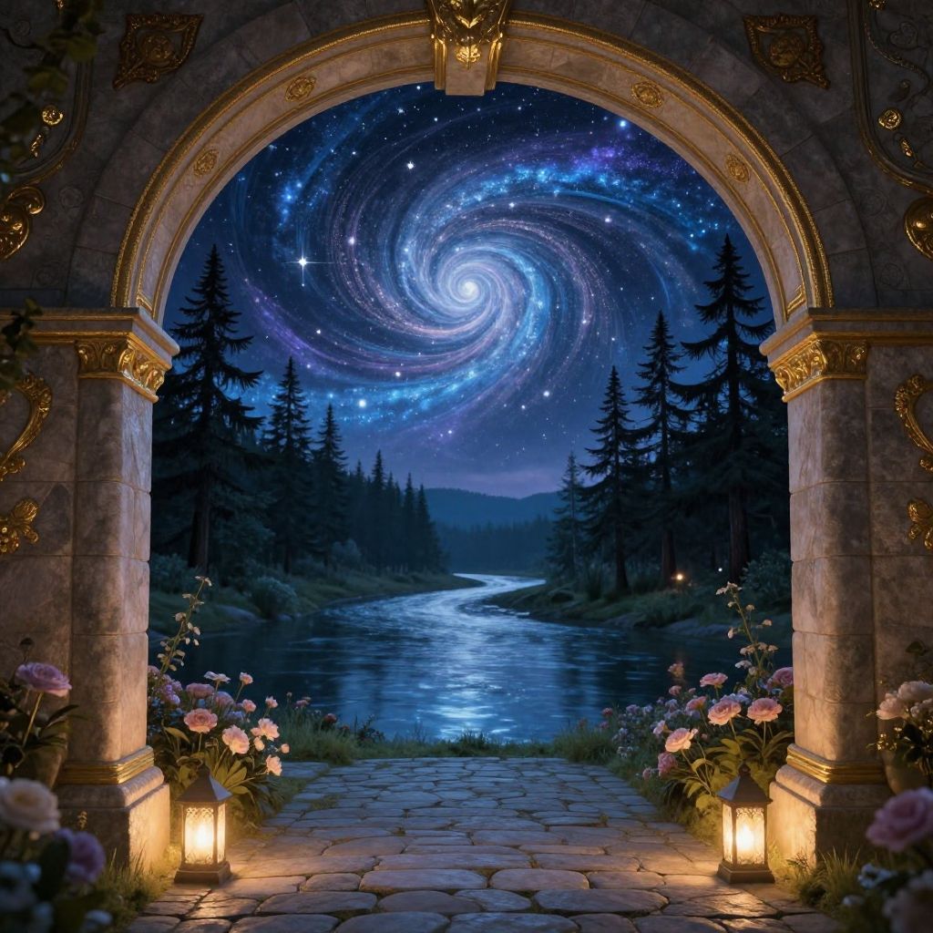 High Dynamic Range Imaging (Hdri) fantasy landscape, stairs full of flowers, highly detailed and elegant composition, intricate detail. Include galaxies and stars,